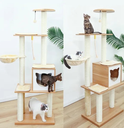 | Durabilidade e estabilidade | A madeira ambientalmente amigável tem força e resistência natural, pode suportar gatos escalar e pular, tem boa resistência à corrosão e resistência a insetos e prolonga a vida útil da árvore do gato |